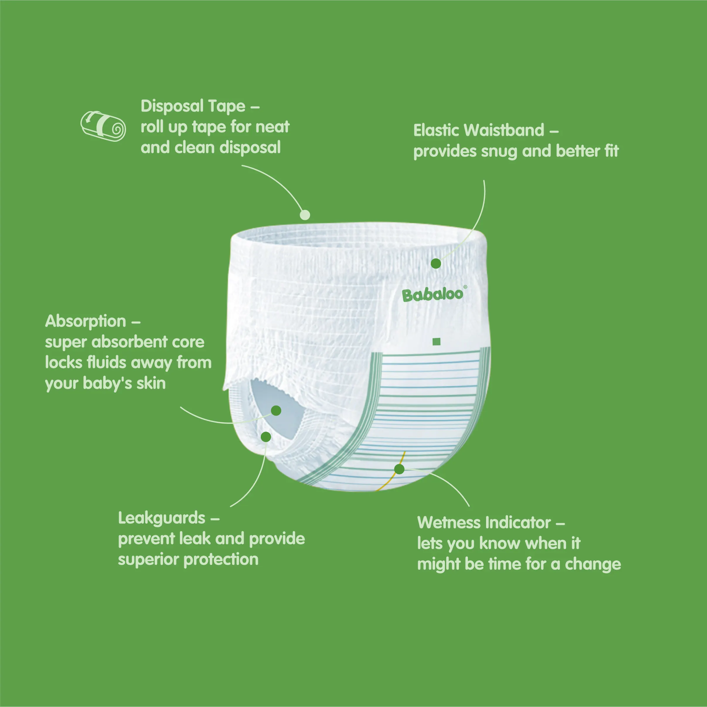 Super absorbent core locks fluids away from your baby’s skin